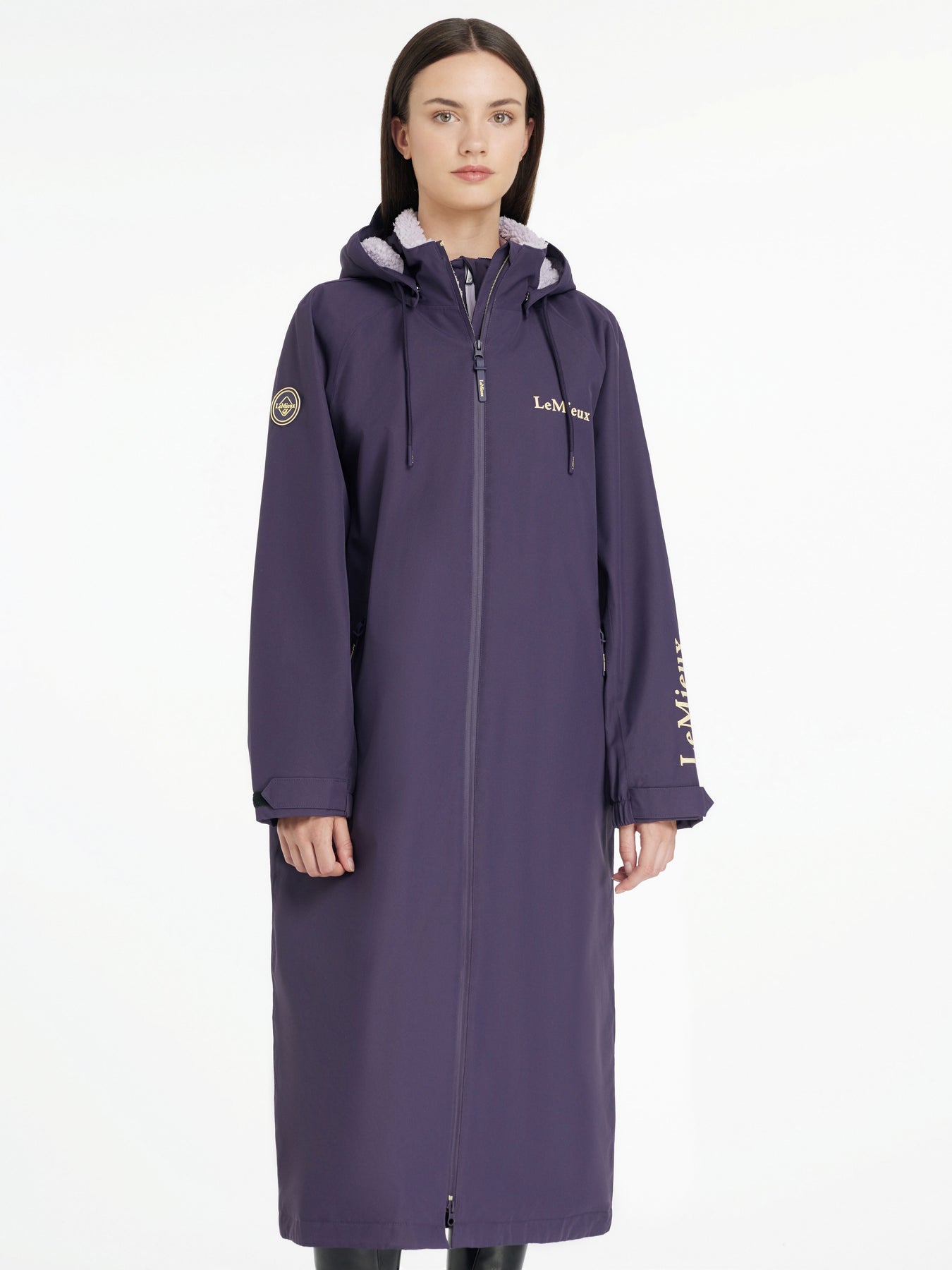 Shelter from the storm in this full-length, oversized, waterproof coat with a moisture-wicking fleece lining. Perfect for riding, changing and even running errands, it's big enough to throw on over clothing and cosy enough to dry off in.
