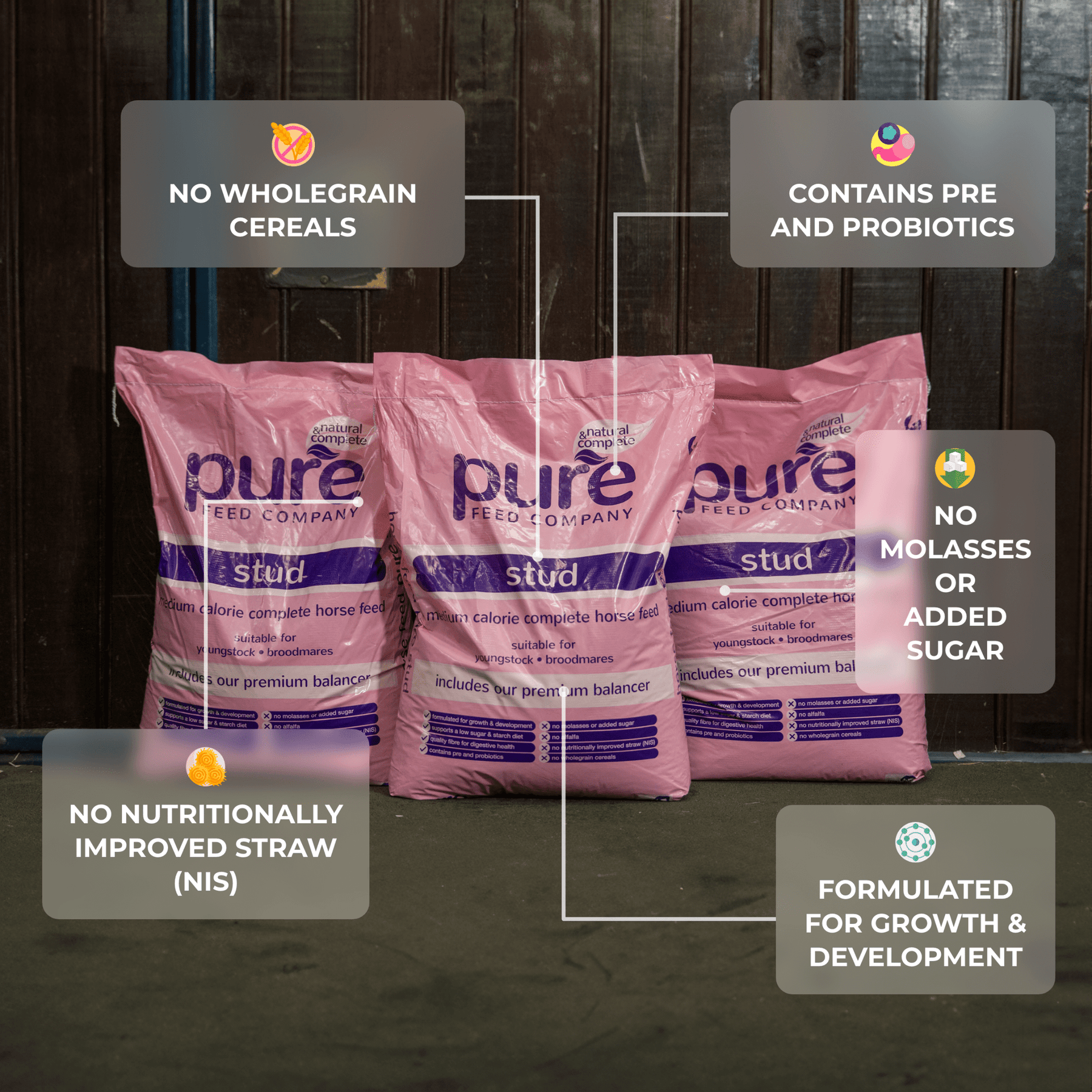 The included balancer ensures that horses receive the right levels of essential micronutrients, including calcium and phosphorus for bone development, as well as key trace elements such as copper and zinc, which are vital for strong hooves, a healthy coat, and immune function. With a low sugar and starch formulation, Pure Stud helps reduce the risk of digestive disturbances and developmental issues in youngstock, while ensuring breeding and working horses have the nutrition they need to thrive.