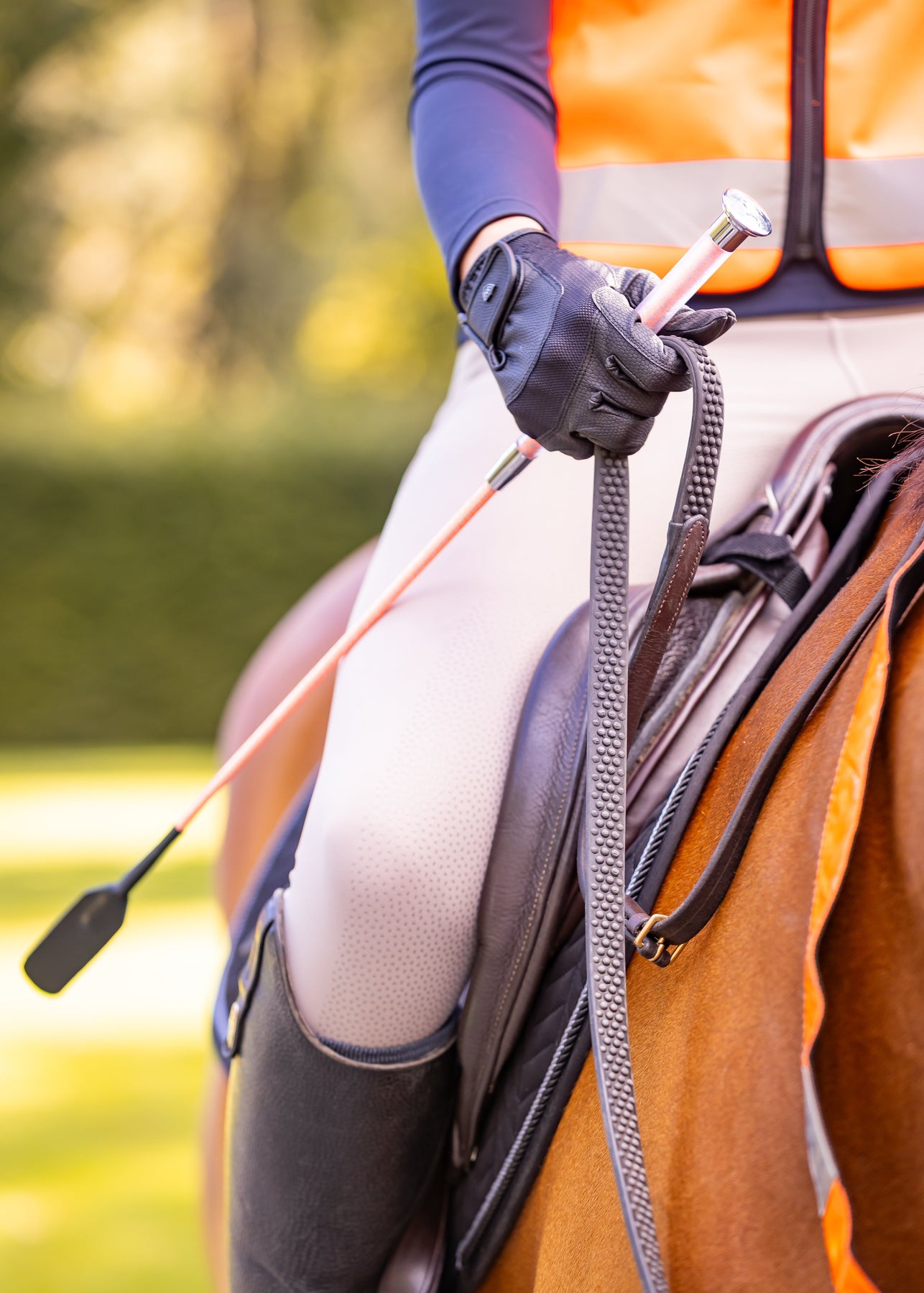 Woof Wear’s Gel Fusion Whip in Hi Vis Orange is designed to deliver control, comfort, and safety in low-light conditions. Ideal for hacking, it features a flexible fibreglass shaft paired with a real leather flapper for clear, responsive aids. The durable, tactile translucent TPR gel handle ensures a secure grip, even in wet weather. At 60cm in length and finished with a branded end cap, this whip offers both performance and enhanced visibility.
