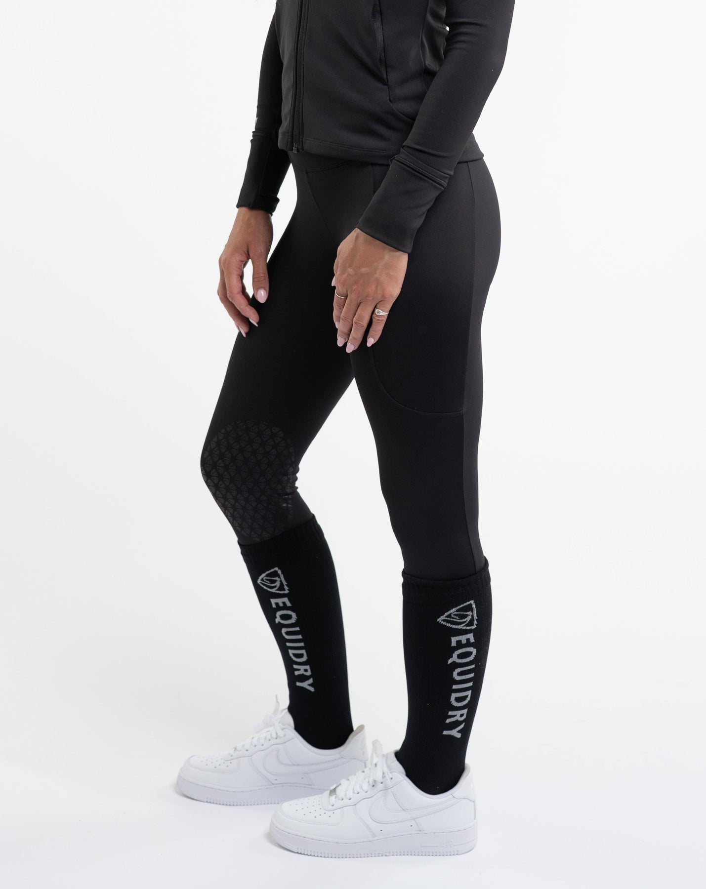 Regular price £35.00 Sale price £31.50 Save 10%The knee length EQUIDRY Waterproof Riding Socks are a must-have for wet and cold outdoor wear. They are crafted using a three-layer bonded construction that combines a 100% waterproof, breathable membrane sandwiched between a durable, stretch nylon blend outer and a stretch, cotton inner. The 4-way stretch along with augmented toe and heel offers a great fit, comfort and wearability.
