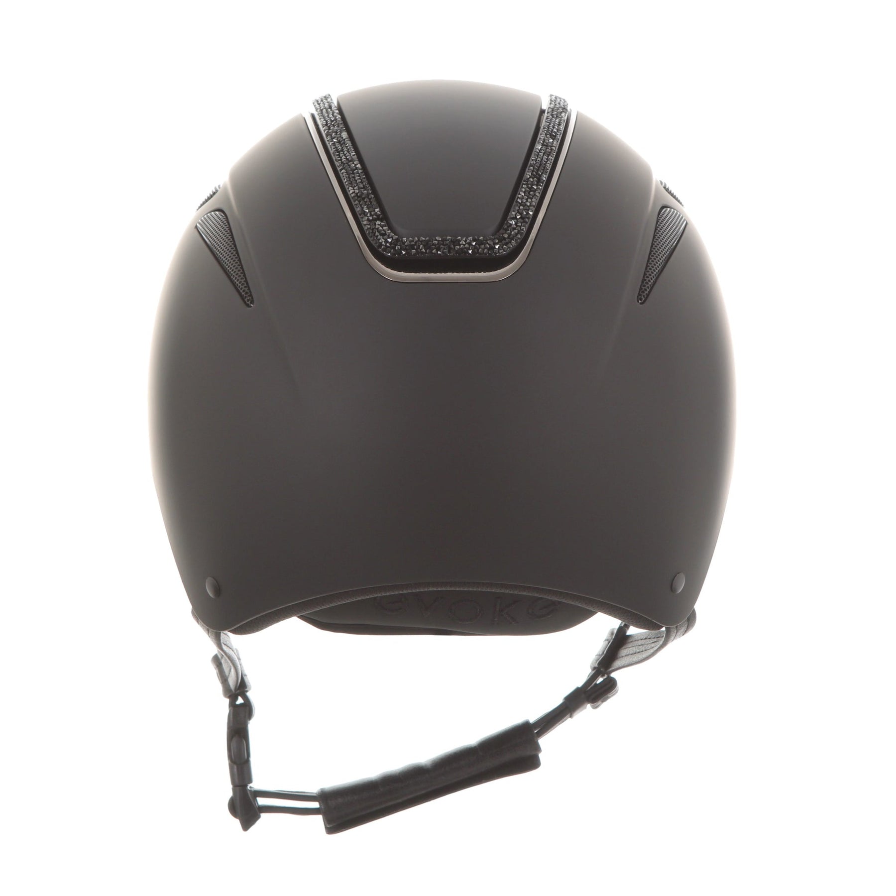 New for 2025, the Callisto Classic peaked riding helmet in a matt black finish with a stylish black crystal and gunmetal vented frame. Subtle black side vents are complimented by chrome & black evoke branding.