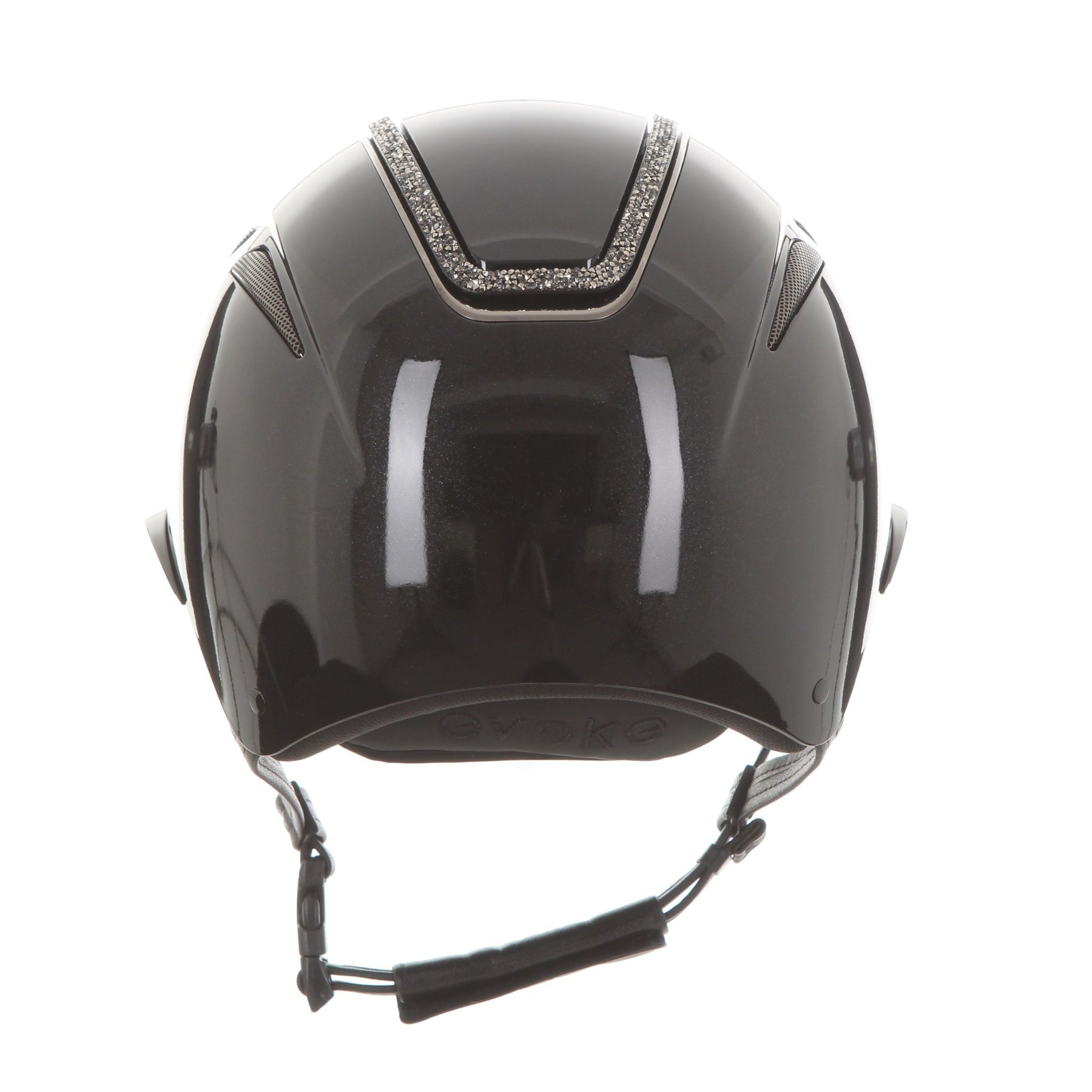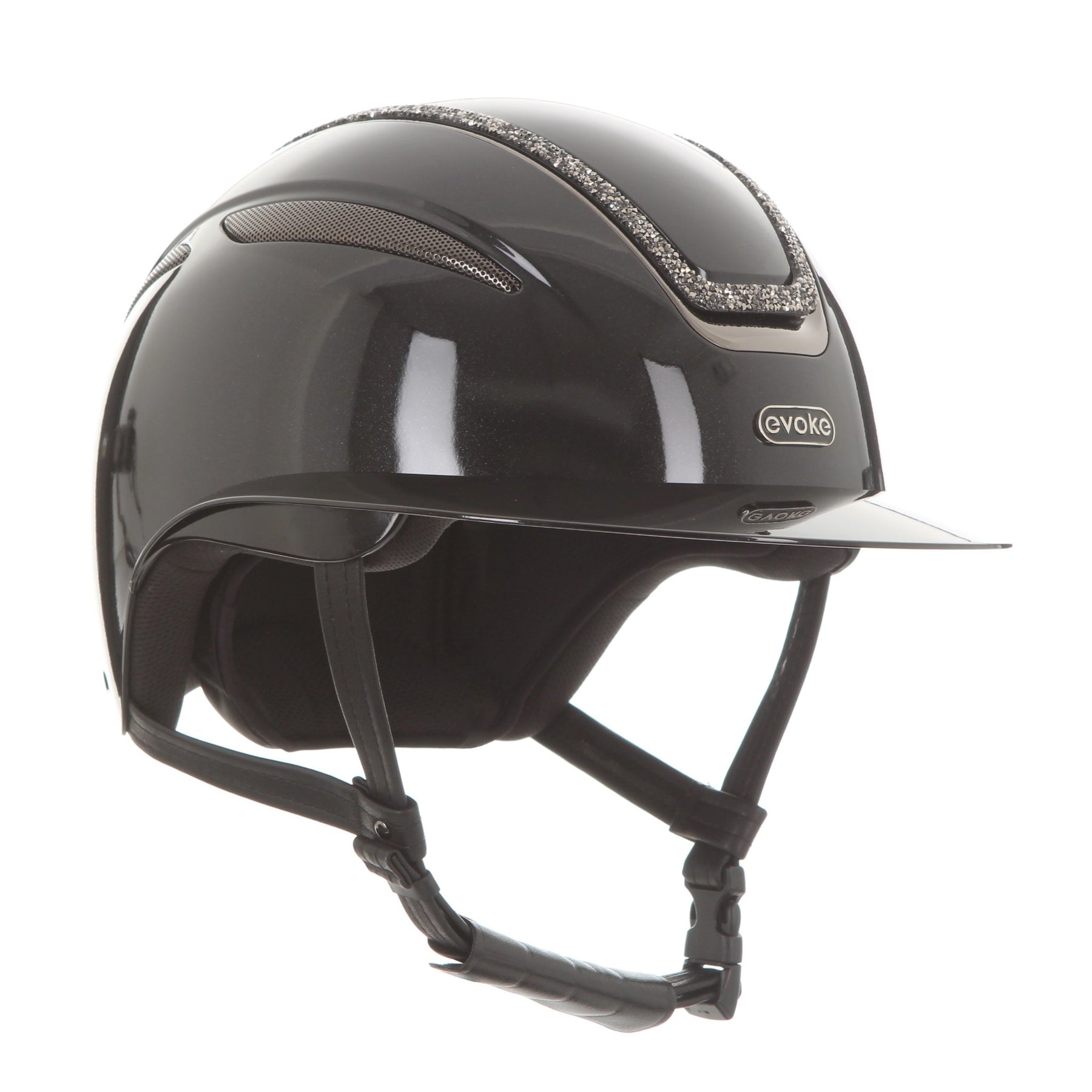 New for 2025, the Callisto Wide peaked riding helmet in a gloss black metallic finish with a glistening marcasite crystal frame. Smart gunmetal side vents are accompanied by black and gunmetal evoke branding.
